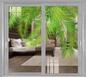 Decal dán kính cao cấp trong suốt lá dừa se153 được in theo kích thước yêu cầu.