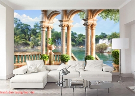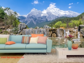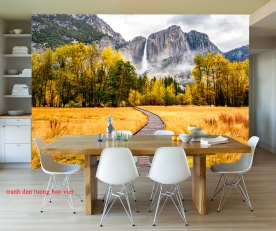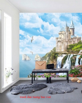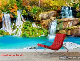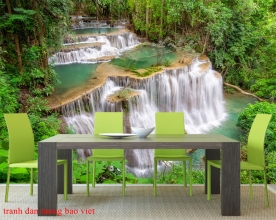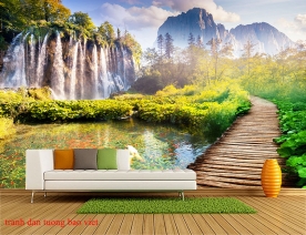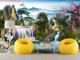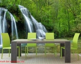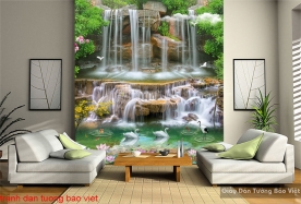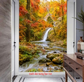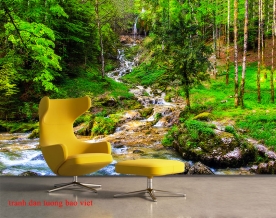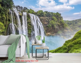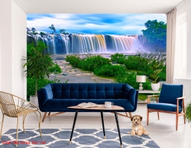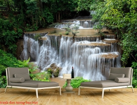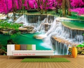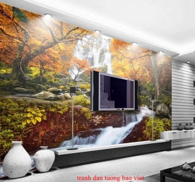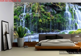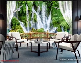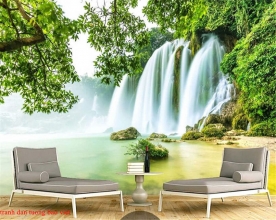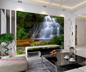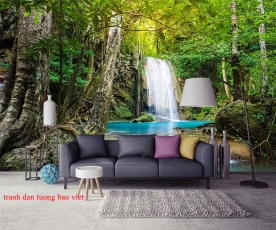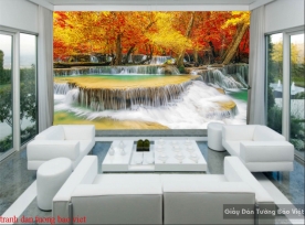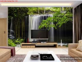 3D waterfall wallpaper ft135 with beautiful natural scenery, with fresh waterfalls flowing in the vast space of trees and trees creating an extremely beautiful natural picture bringing fresh colors new for your house, making the room become larger, cooler, no longer cramped, cramped as usual. Wallpaper which is made from glittering metallic saffron paper and high-grade Korean paper bring the most vivid and realistic image.
