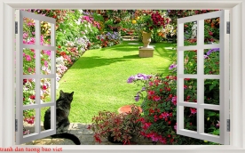 Window murals tr20 with pictures of beautiful natural landscapes of the garden with many fresh green trees radiating shade provide a very romantic living space, fresh air, fresh air to help the room always filled with life, becoming more airy and spacious. Wallpaper made from glittering metallic saffron paper and premium Korean paper brings the clearest and most realistic image.