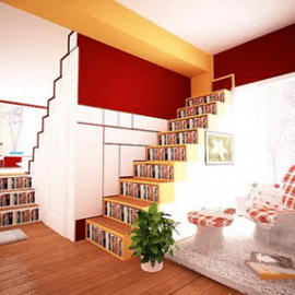 Chiếc cầu thang này chọn gam màu xanh lam làm màu chủ đạo, tuy nhiên mỗi bậc thang lại được dán các miếng giấy họa tiết khác nhau. Đặc biệt, ở phần giữa chủ nhà còn sử dụng giấy dán màu đỏ khác biệt nổi bật làm điểm nhấn.