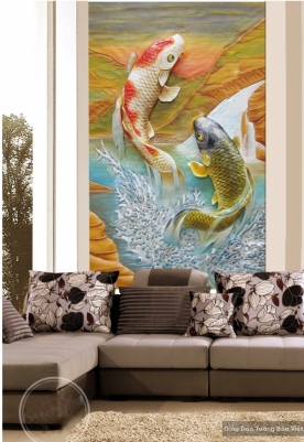 It is no coincidence that these wallpapers become the first choice for those who want to create a private place full of life. You will find a balance between heaven and earth, between water and living creatures. Also known as the harmony between the feeling of stillness and motion. Typically, two fish are swimming forcefully and extremely vividly. They symbolize life, growth, and growth. A common point can be noticed is that most of these products are presented in the form of 3d wall paintings . Only that way will make viewers fully feel the near and far corners of the scene to bring the most true feelings. Just one minute to focus on looking at the drawings, you will be completely attracted by the deep and magical space. Perhaps this success also comes from the combination of extremely intelligent blood. The blue color of the water blends with the reds and yellows of the two fish and the greenness of the land and mountains. The ingenious use of hot and cold colors makes this picture perfect to the visual level. Cheap wallpaper