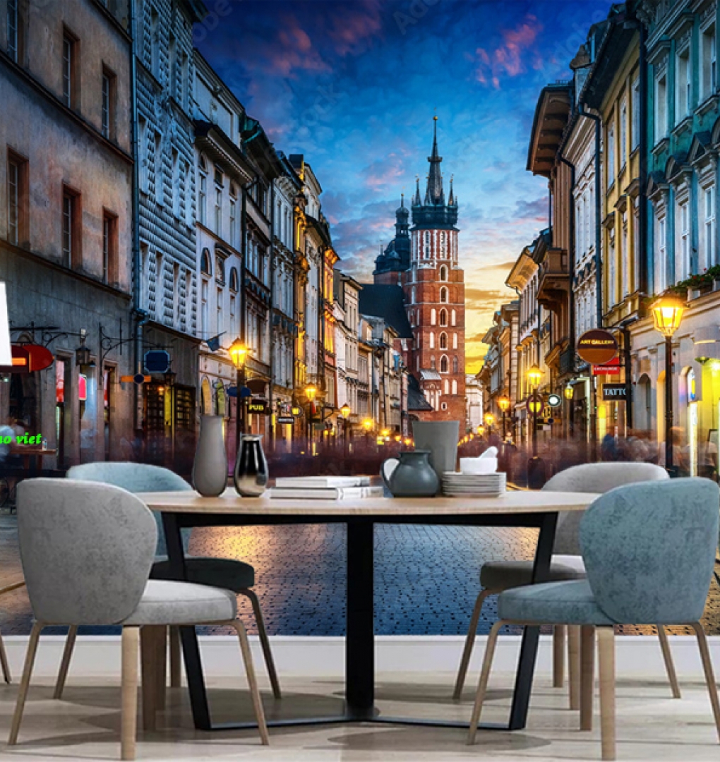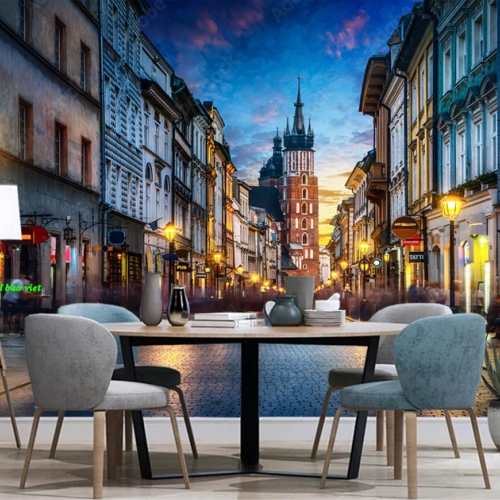 Giấy dán tường phòng khách 3d n2004-360 với khung cảnh êm đềm, thơ mộng của thành phố Châu âu lúc lên đèn mang đến sự tươi mới...