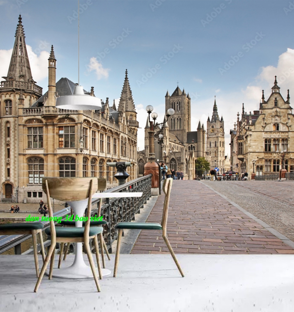 Giấy dán tường phòng khách n2004-485 với cảnh thành phố êm đềm, thơ mộng, kiến trúc cổ kính, độc đáo khiến căn phòng trở nên sống...